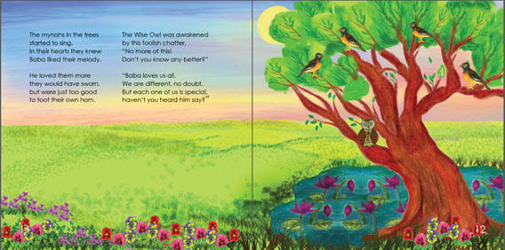 divided society is expressed by the wise owl: “Baba loves us all/We are different, no doubt. /But each one of us is special, / haven’t you heard him say?” As the narrative progresses the protagonists begin to transform. With their jealousies gone they experience their lovely landscape with Baba at its center, and enchanted, they elicit: “Please tell us more about/the message divine, / and the miracle of love /that will change our lives.”