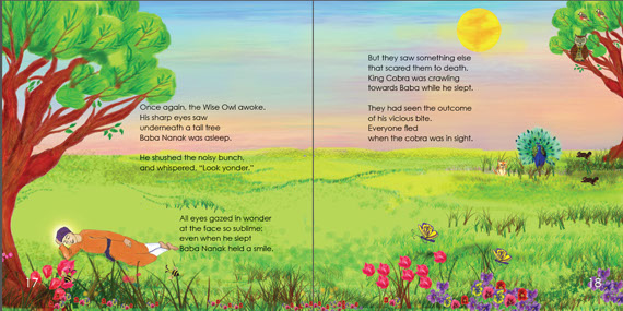 The garden of Talwandi is alive with animals and birds and flowers and trees and ponds and clouds, and even a king cobra. Artist Arshia Singh illustrates these various protagonists animated with individual character and attitude. At the beginning of the story the roses, lilies, bunnies, and mynahs are petty and competitive: each one vies to be praised by Baba Nanak. But when they witness the venomous king cobra spreading his hood to shade a serenely sleeping Nanak, they realize the supreme power of Guru Nanak’s personality and his love for each and all. The much needed pluralism in our dangerously